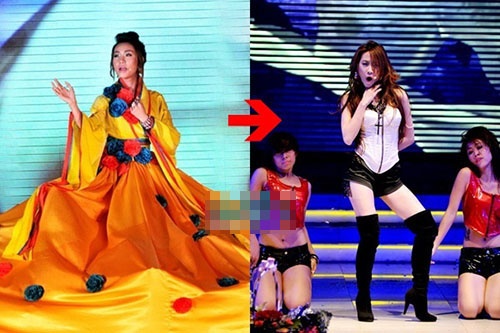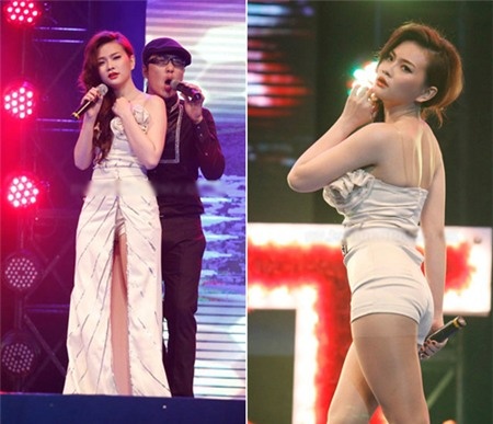 | Thể hiện hai ca khúc liên tiếp, bởi vậy Yến Trang đã chọn cách cởi đồ để làm mới hình ảnh của mình. |