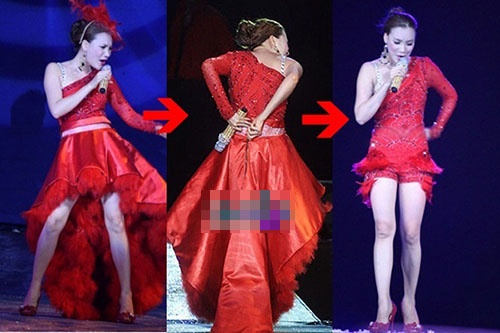 | Mỹ Tâm gây ngạc nhiên cho khán giả khi chỉ bằng vài thao tác đơn giản thôi là đã có thể cởi bỏ lớp áo ngoài trên sân khấu. |