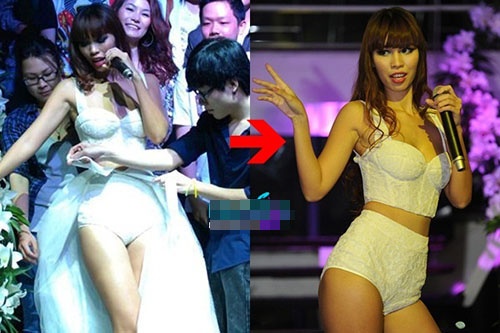 | Khán giả choáng với màn cởi đồ táo bạo của Hồ Ngọc Hà trên sân khấu. |