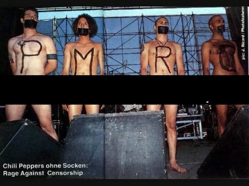 Năm 1993, để chống lại sự kiểm duyệt của PMRC (Parent's Music Resource Center) vì ngăn giới trẻ đến với nhạc metal, nhóm nhạc Rage Against The Machine đã có hành động táo bạo. Trên sân khấu Lollapalooza, 4 thành viên gồm Zack de la Rocha, Tom Morello, Tim Commerford, và Brad Wilk đứng khỏa thân suốt gần 15 phút, miệng dán băng keo, trên người có ghi P- M- R- C. Ngày hôm sau, cả nhóm đã dành tặng một show diễn miễn phí cho khán giả. Sự kiện này trở thành một trong những hành động nổi loạn nhất của âm nhạc thời hiện đại.
