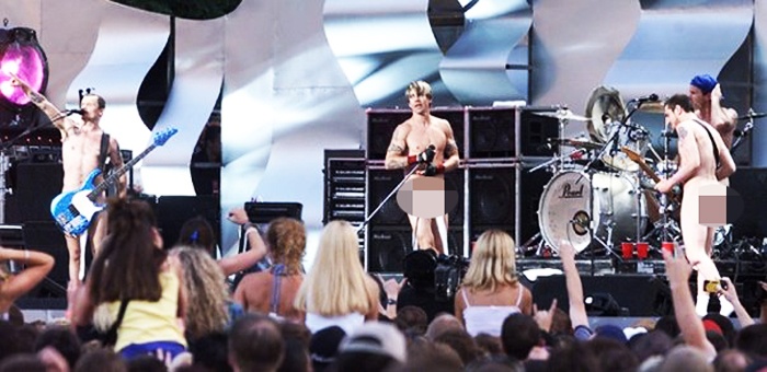 Nhóm nhạc rock Red Hot Chili Peppers trong thập niên 90 đã có khá nhiều buổi diễn trong tình trạng không mặc gì trên sân khấu, ngay cả khi hát live, đặc biệt phần kín đáo được “che chắn” bằng những chiếc tất trắng. Nét “đặc trưng” trong biểu diễn ca nhạc của nhóm trở nên nổi tiếng và thậm chí còn trở thành văn hóa chính thống, một tập phim của series hoạt hình nổi tiếng The Simpsons đã đưa Red Hot Chili Peppers vào phim.