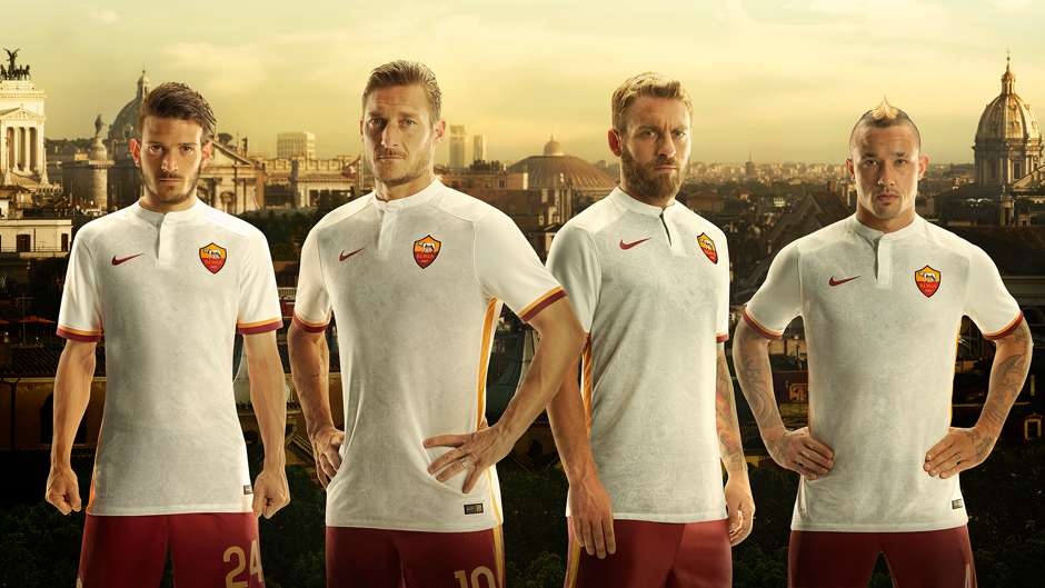 | Trang phục thi đấu sân khách của Roma mang màu trắng. Cổ áo cũng được thiết kế khác với bộ cánh sân nhà. |