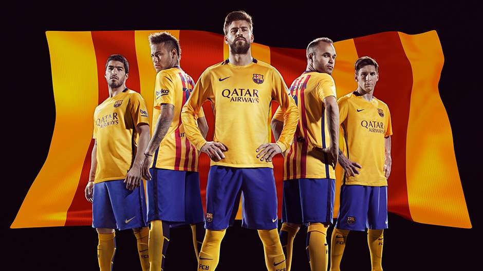 | Mẫu áo sân khách của các học trò HLV Luis Enrique mang màu vàng chủ đạo. Sau lưng là 4 sọc đỏ lớn chạy dài từ cổ xuống chân áo. Đây cũng là màu cờ xứ Catalunya. |