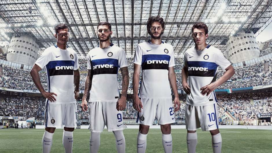| Trang phục sân khách của Inter mang màu trắng chủ đạo. Tuy nhiên, trước ngực áo được làm cách điệu với hai sọc lớn xanh - đen", màu truyền thống của CLB. |