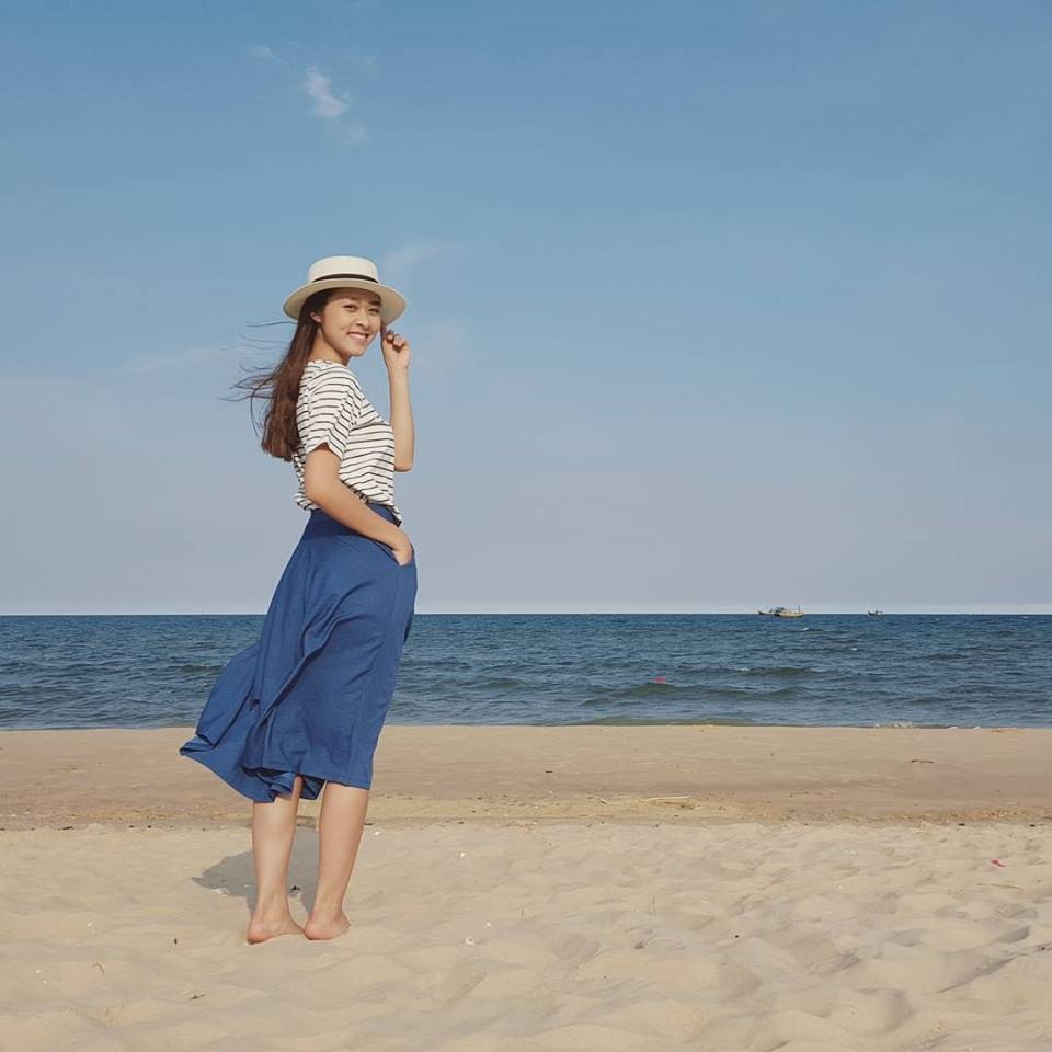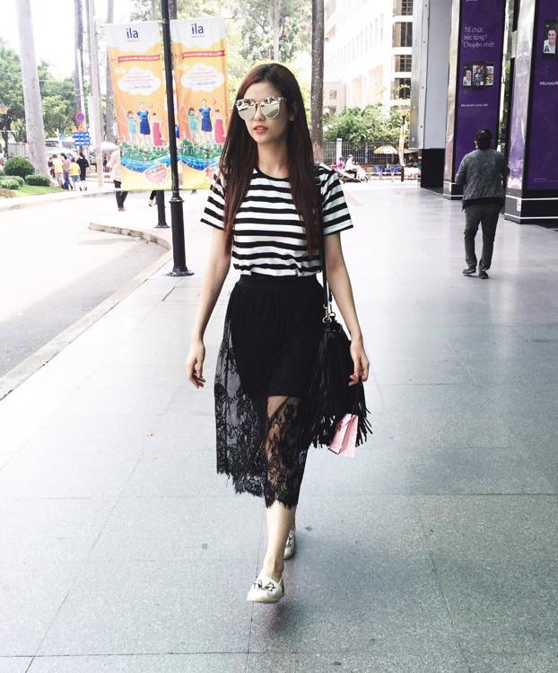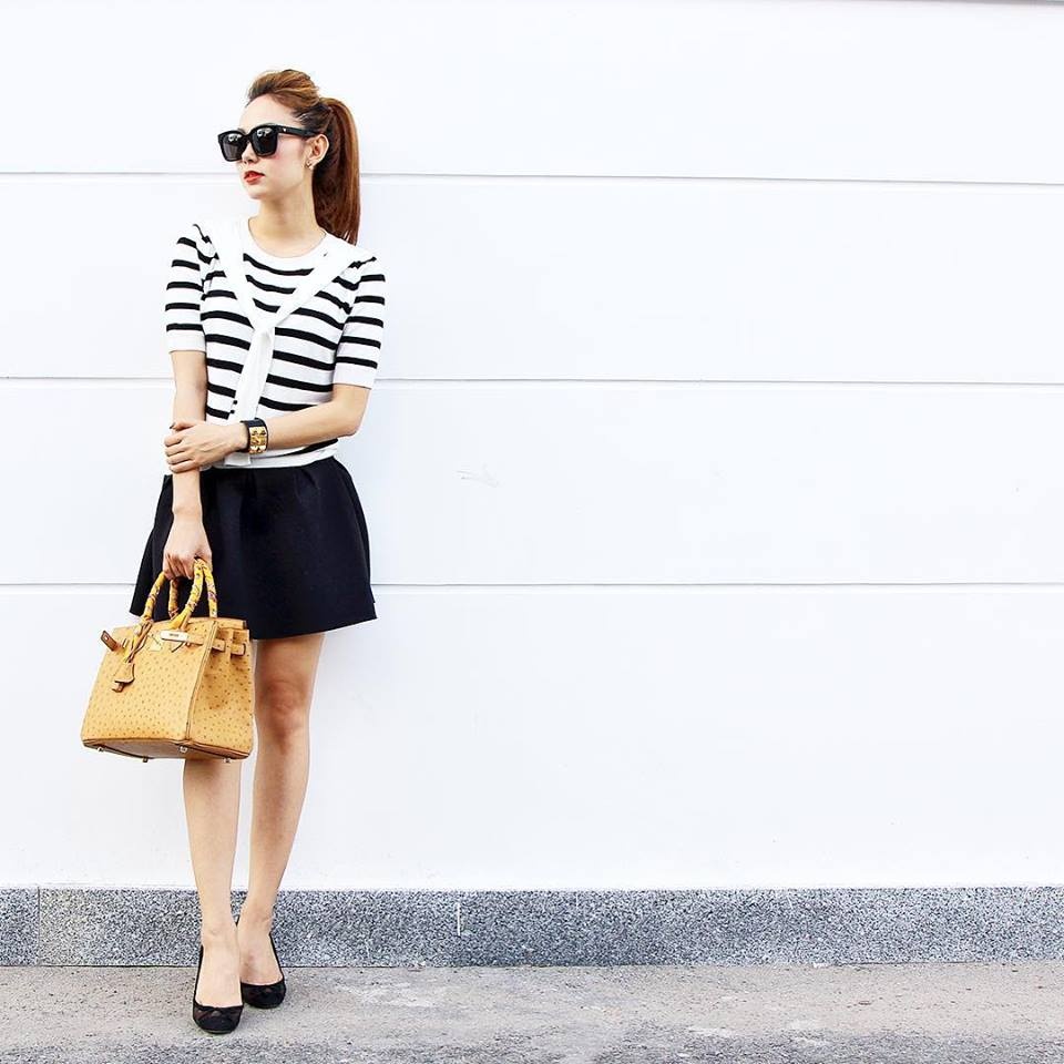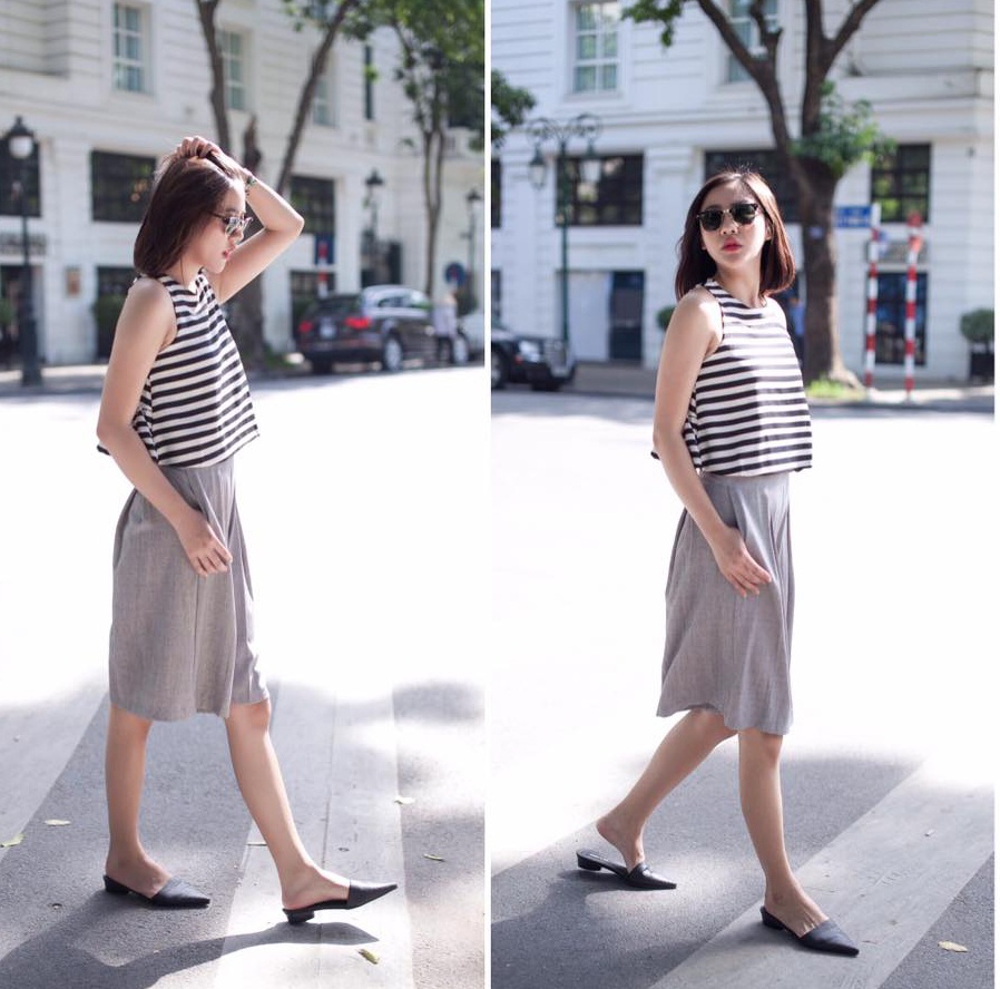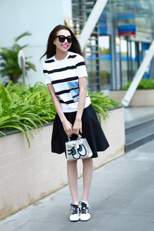 | Minh Hằng gợi ý mix áo kẻ ngang và váy xòe rất dễ thương. |