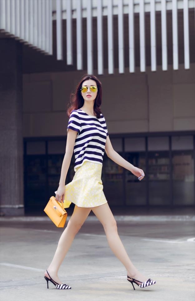 | Diễm My mang đến cách phối màu mới mẻ với họa tiết chấm bi và họa tiết kẻ ngang, giúp cô trở nên trẻ trung và nổi bật. |