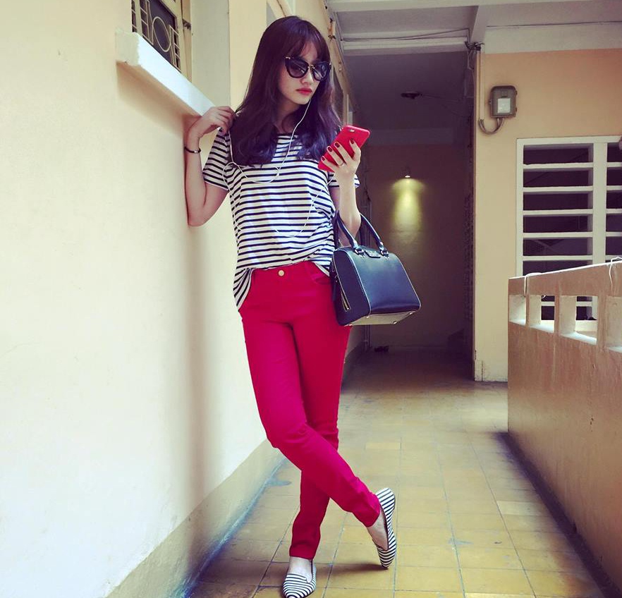 | Văn Mai Hương xuống phố với áo kẻ ngang và quần lửng hết sức trẻ trung. |