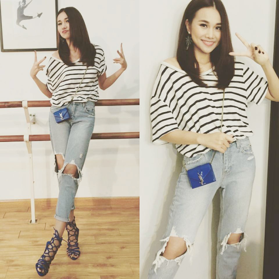 | Thanh Hằng ăn gian tuổi cùng mốt quần xé và áo thun kẻ trễ vai. |
