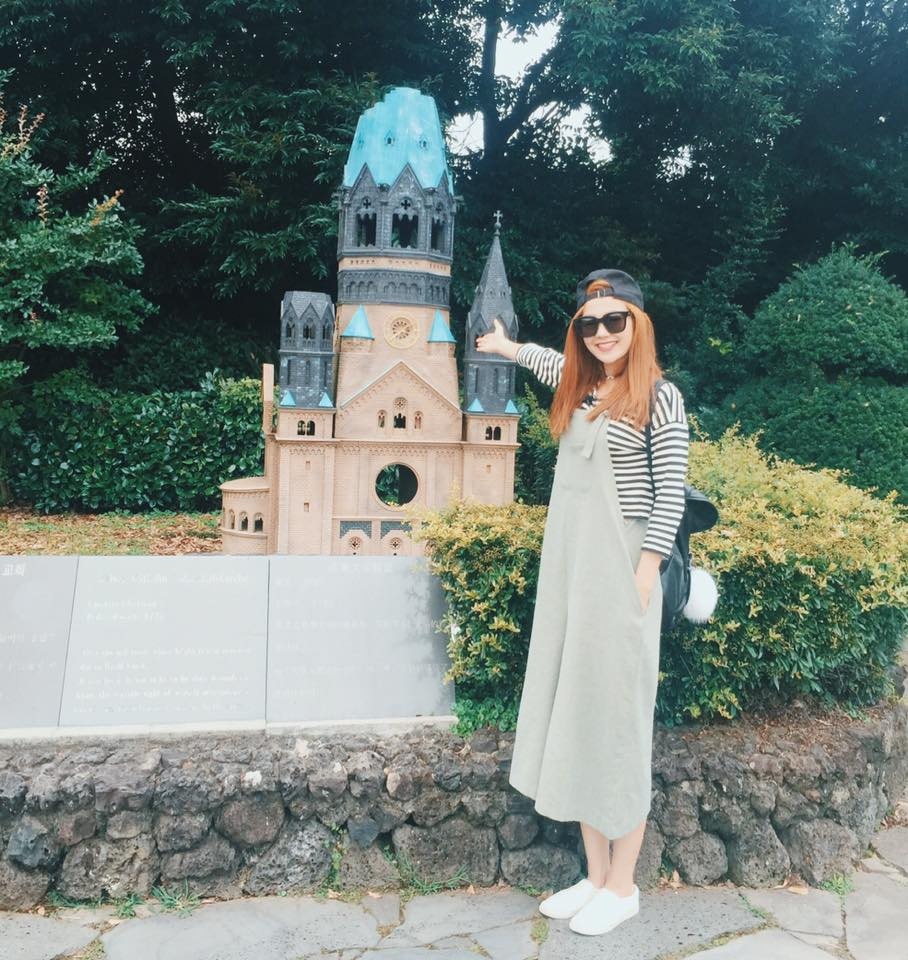 | Cô nàng còn thường xuyên dùng áo thun kẻ khi diện kèm mốt quần yếm. |