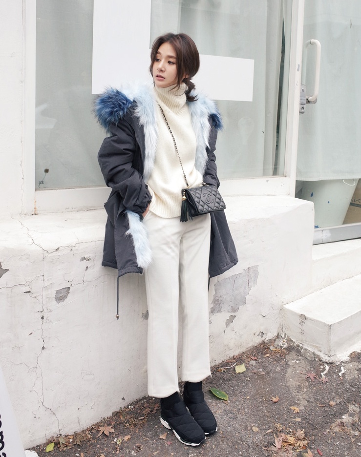 | Áo jacket kết hợp chất liệu lông ấm áp và trẻ trung khi mix kèm giày thể thao. |
