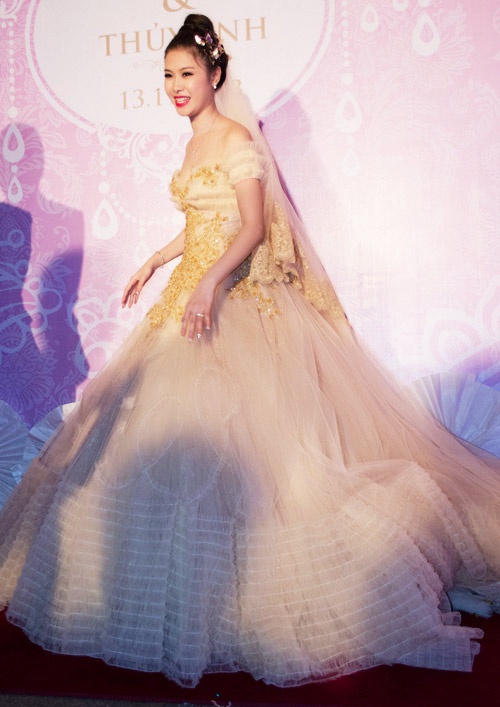 Váy cưới của hot girl Thủy Anh tuy có vướng đôi chút nghi vấn về giá cả những vẫn được người hâm mộ khen ngợi là đẹp nhất nhìn showbiz Việt năm 2013. Cô thay khá nhiều váy cưới trong dịp trọng đại của cuộc đời. Từ những chiếc váy đuôi cá quyến rũ cho đến chiếc váy chít eo xòe bồng bềnh mà cô lựa chọn đều đã nói lên sự tinh tế và con mắt thẩm mỹ của Thủy Anh.