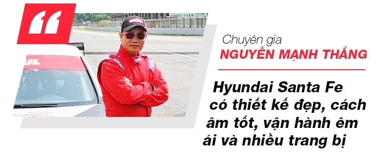 Theo chuyên gia Nguyễn Mạnh Thắng, Hyundai Santa Fe có nhiều ưu điểm như thiết kế đẹp, vật liệu nội thất cao cấp, cách âm tốt, vận hành êm ái, nhiều trang bị và chi phí sử dụng thấp.