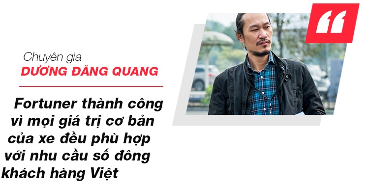 Chuyên gia Dương Đăng Quang cho rằng, thành công của Toyota Fortuner đến từ việc mọi giá trị cơ bản của chiếc xe đều phù hợp với nhu cầu của số đông khách hàng Việt. Bản nâng cấp 2020 sắp ra mắt với nhiều thay đổi mạnh mẽ hứa hẹn sẽ giúp Fortuner có thêm sức hút.