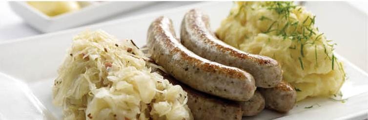 | Đặc biệt nhất là Weisswurst - xúc xích trắng đặc trưng làm từ thịt bê dùng kèm mù-tạt ngọt và bánh mì xoắn Brezel. |