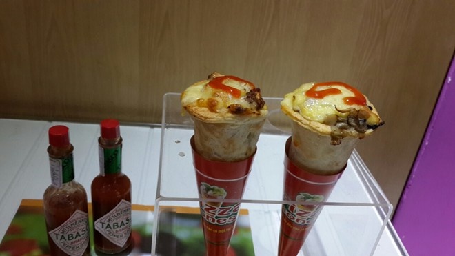 | 9. Bánh pizza ốc quế: Những chiếc bánh pizza đựng trong vỏ bánh được tạo hình như ly kem ốc quế vừa vặn cho một người ăn mang đến cho giới trẻ trải nghiệm lý thú về món ăn này. Ảnh: Hà Mỹ Giang. |