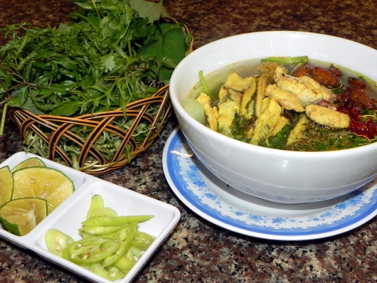 | Bún cá miền Tây là tên gọi chung của món bún cá đến từ ba tỉnh Châu Đốc, Kiên Giang và Hà Tiên. Gọi là bún cá song món ăn này không chỉ có cá mà còn có nhiều loại hải sản (tôm, mực), thịt heo quay. Ảnh: An Huỳnh. |