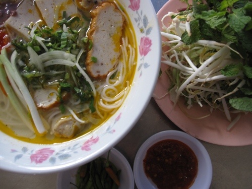 | Sài Gòn có ba loại bún chả cá đến từ ba tỉnh khác nhau là Nha Trang, Quy Nhơn và Đà Nẵng. Về cơ bản, ba loại này giống nhau về nguyên liệu, thành phần. Điểm khác biệt nằm ở cách trang trí, hương vị món ăn. Ảnh: An Huỳnh. |