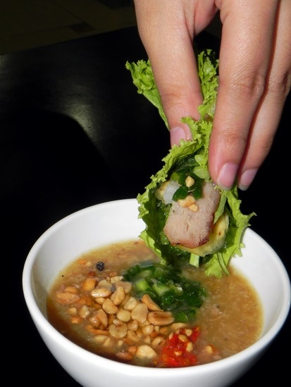 | Cá nục hấp cuốn bánh tráng có vị tươi ngon của cá, thơm giòn của bánh tráng nướng, tươi của rau, đậm đà của nước cá kho. Ảnh: Linh San. |
