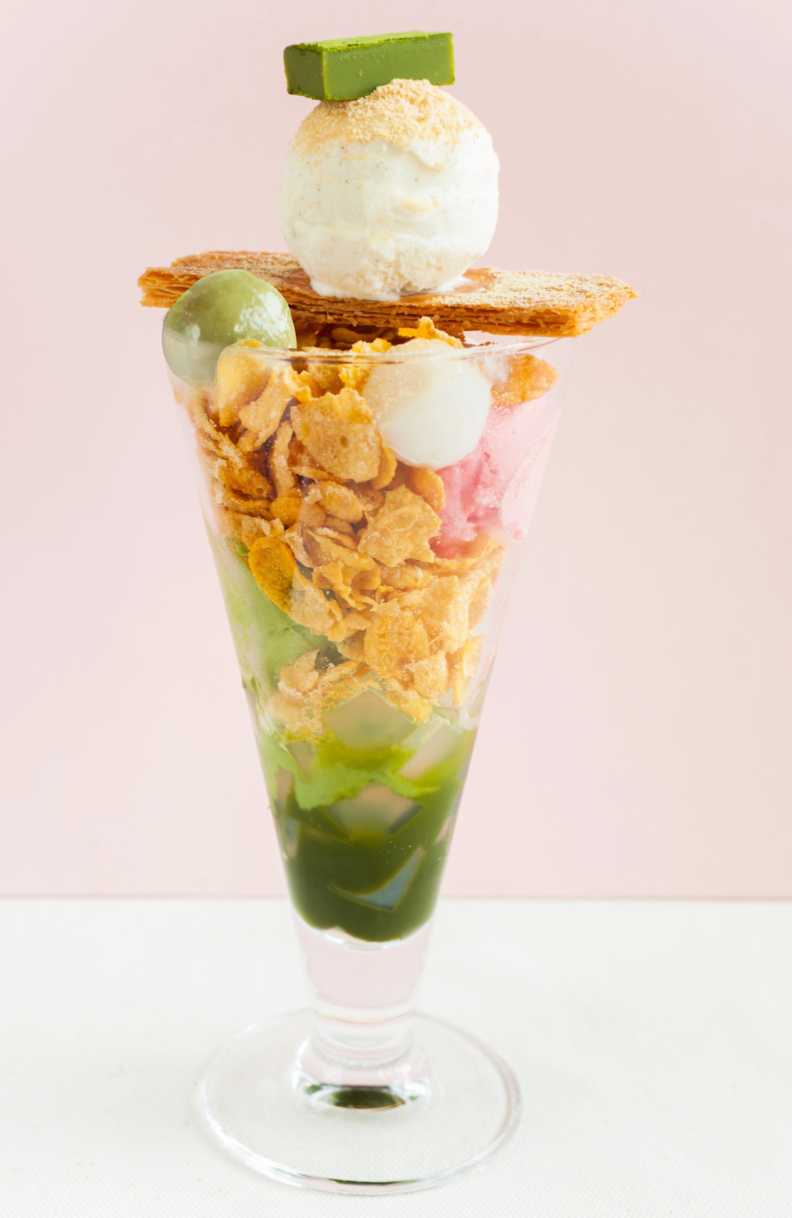 Haru Haru Parfait: Trong tiếng Nhật, "Haru" nghĩa là mùa xuân. Haru Haru Parfait nhiều sắc màu với tạo hình độc đáo kết hợp kem đậu nành rang Kinako Nhật Bản thơm lừng cùng bánh ngàn lớp mille feuille, kem trà xanh, kem raspberry, socola tươi trà xanh và 3 loại shiratama trắng, trà xanh và dâu. Đặc biệt, khi gọi món này, bạn sẽ được nhân viên tư vấn về cách ăn. Đó là bạn cần dùng viên chocolate trà xanh trước, sau đó, cầm bánh mille feuille lật ngang lại để viên kem kinako rớt vào trong ly, rồi bắt đầu thưởng thức các thành phần trong ly cùng bánh mille feuille.