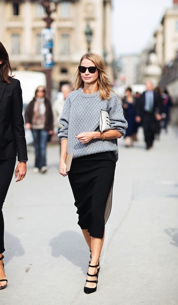 Với tần suất của những lớp áo len, áo khoác..vv.. thì việc diện một chiếc chân váy xòe, chân váy suông không phải là một gợi ý hay. Chúng có thể khiến bạn thú vị, nhưng hoàn toàn không tôn lên dáng người của bạn, và trừ khi bạn là một siêu mẫu với vóc dáng chuẩn mực, không thì set đồ đó sẽ biến bạn thành một cái cây treo quần áo di động. Lựa chọn ở đây là những chiếc chân váy midi ôm. Chúng giúp bạn nhìn gọn gàng hơn, tạo đường cong và giúp bạn phô bày nó, hơn nữa chúng cân đối cơ thể bạn khi phải khoác lên mình tầng tầng lớp lớp áo dày.
