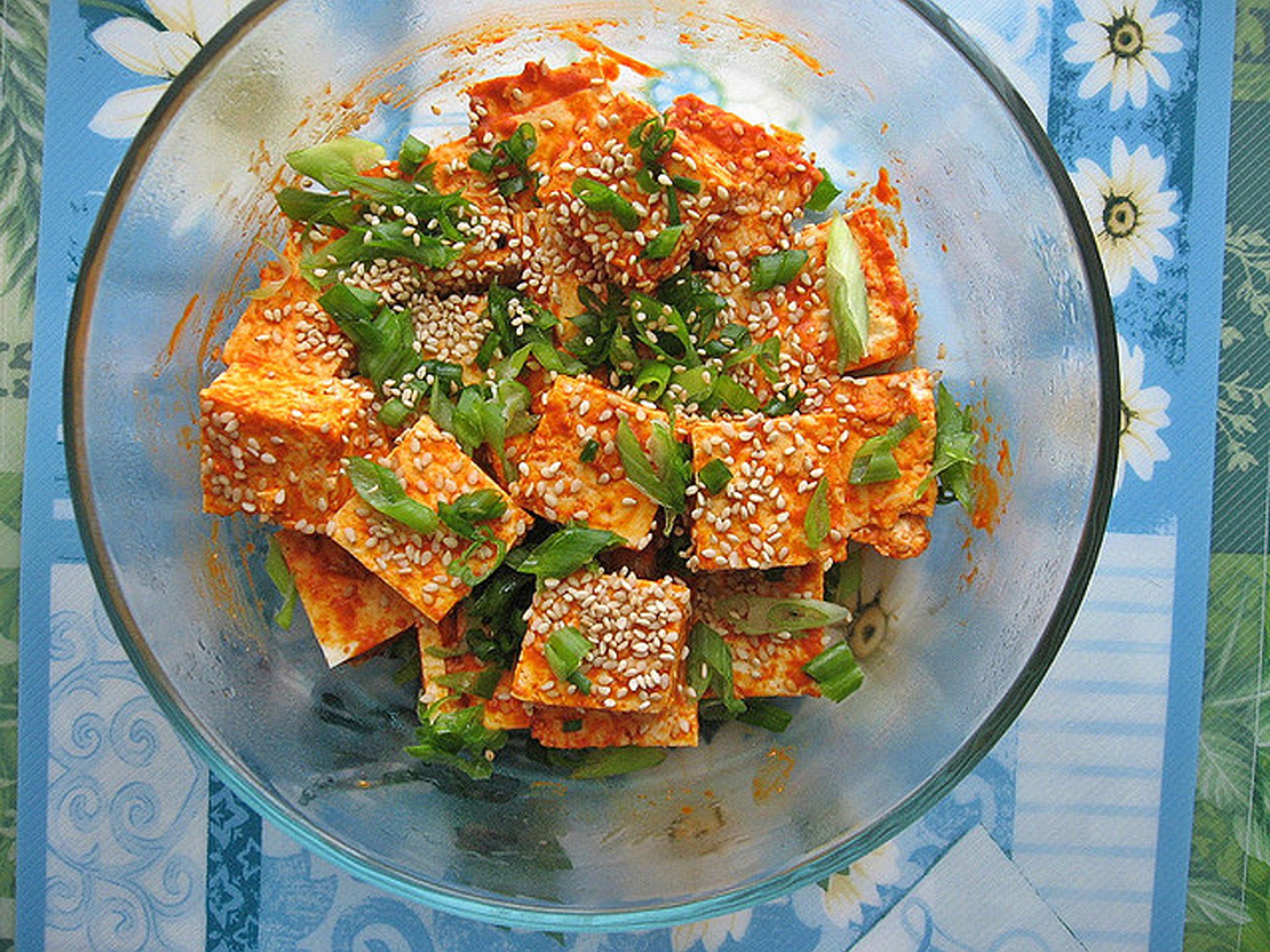 Đậu phụ cay: Món đậu phụ được tẩm ướp rồi để lạnh sau đó mới thưởng thức. Món ăn này rất thích hợp với những ngày hè nóng nực. Ảnh: Teczape. |