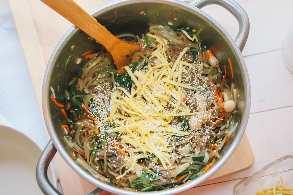 Miến trộn japchae: Nguyên liệu miến được làm từ khoai lang, xào với rau củ và thịt thơm ngon. Ảnh: Her Name Is Shin. |