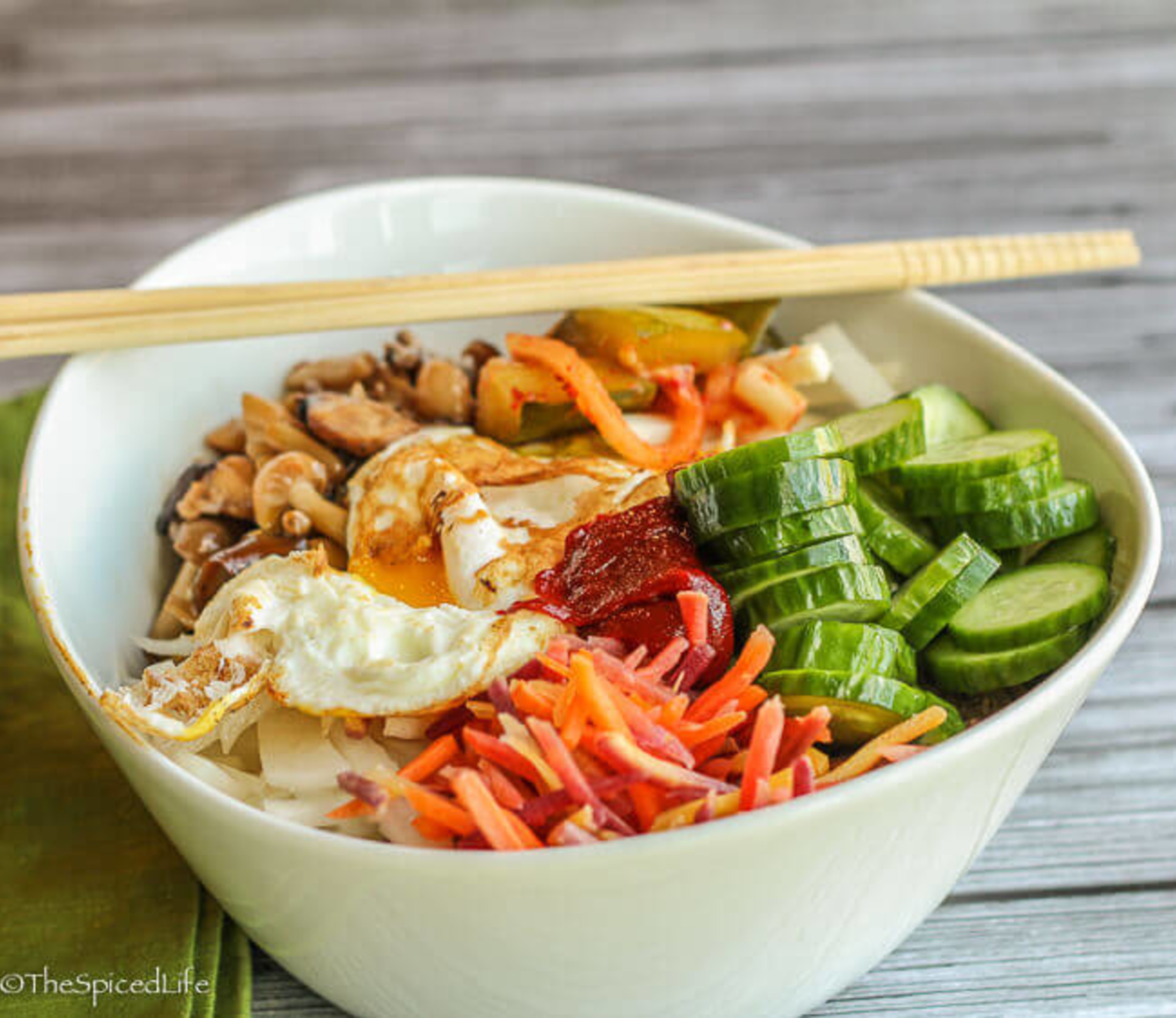 Bibimbap: Bibimbap hay còn gọi là món cơm trộn Hàn Quốc. Tất cả các nguyên liệu gồm các loại thịt, rau củ và trứng được trộn chung vào một bát cơm lớn, ăn cùng với kim chi, quá tuyệt. Ảnh: The Spiced Life. |