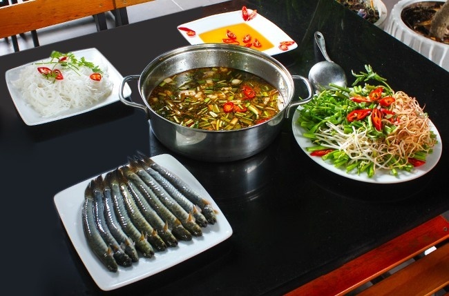 Lẩu cá kèo lá giang ngon nhất nhờ có cá kèo tươi sống. Thịt cá dai ngọt, lá giang chua nhẹ ăn cùng hoa chuối, rau đắng, giá đỗ, rau muống chẻ... khá hấp dẫn. Nước chấm của món lẩu này là nước mắm me. Ảnh: Tin89. |