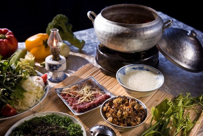 Lẩu mắm có nước dùng được nấu từ hai loại mắm chỉ có ở vùng đất này. Lẩu mắm kích thích vị giác của người ăn bởi hương thơm đậm đà, thịt thà phong phú cùng nhiều loại rau đặc trưng vùng sông nước như điên điển, cọng bông súng, rau đắng, hoa so đũa, thèo nèo... Ảnh: An Huỳnh. |
