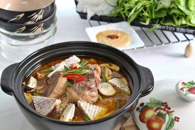 Lẩu lươn miền Tây có vị chua nhờ cơm mẻ, me xanh hay trái giác. Lươn ăn lẩu là lươn sống, khi nước sôi thì thả vào cho ngọt nước. Rau ăn kèm không thể thiếu của món ăn nay là bắp chuối bào, ngoài ra còn có rau muống, rau nhút, kèo nèo, giá, bạc hà... Ảnh: Hivietnam. |