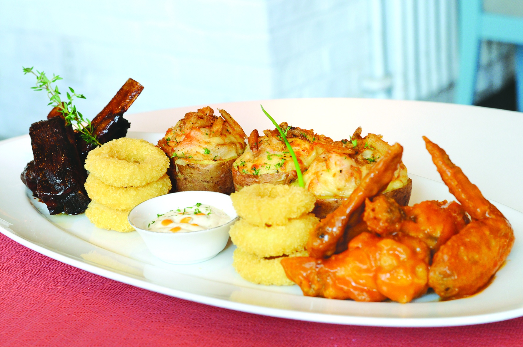 | All in one: Là sự kết hợp giữa món nachos, cánh gà cay dùng kèm khoai tây nhồi đút lò. |