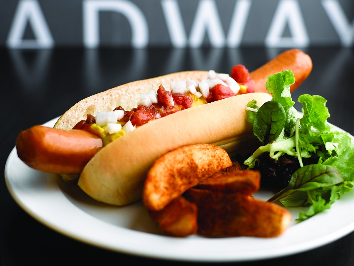 | Boney dog: Xúc xích heo cỡ lớn được kẹp vào bánh mì và phủ trên cùng là sốt mù tạc dưa chua, cùng sốt cà cay kiểu Mexico và hành tây. |