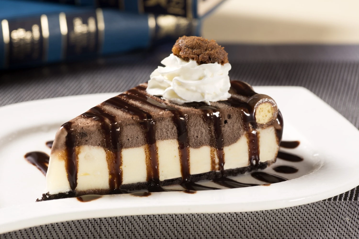 | Bánh kem vị Chocolate và hạt Macademia với đế bánh Oreo và vụn bánh cookie tự làm. Trang trí với chocolate và kem tươi. |