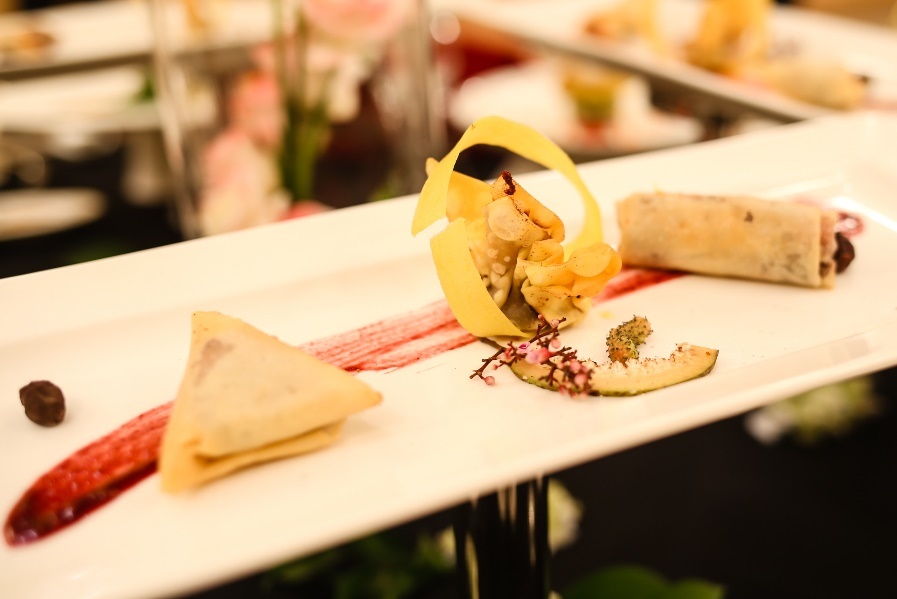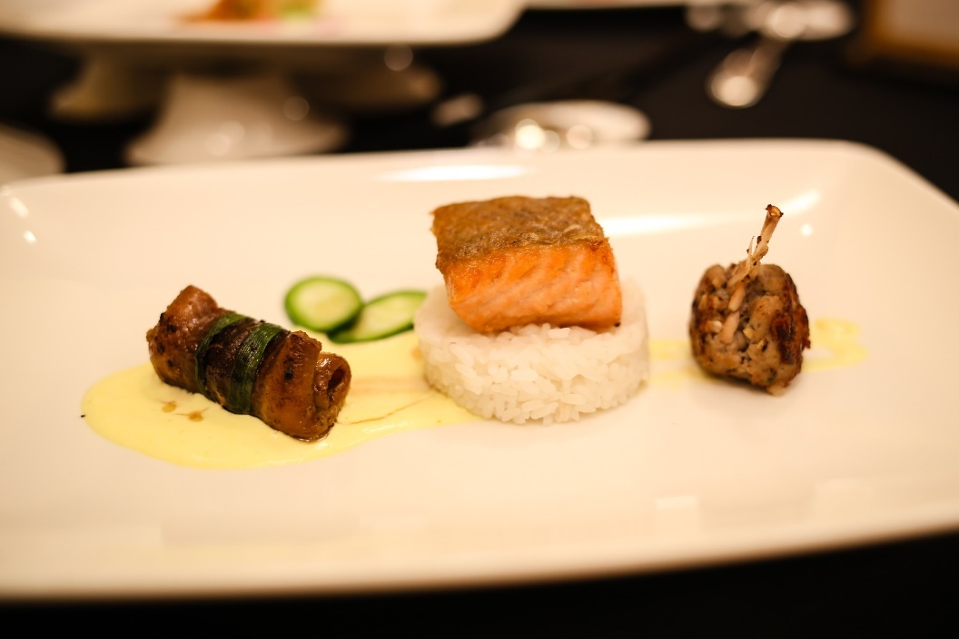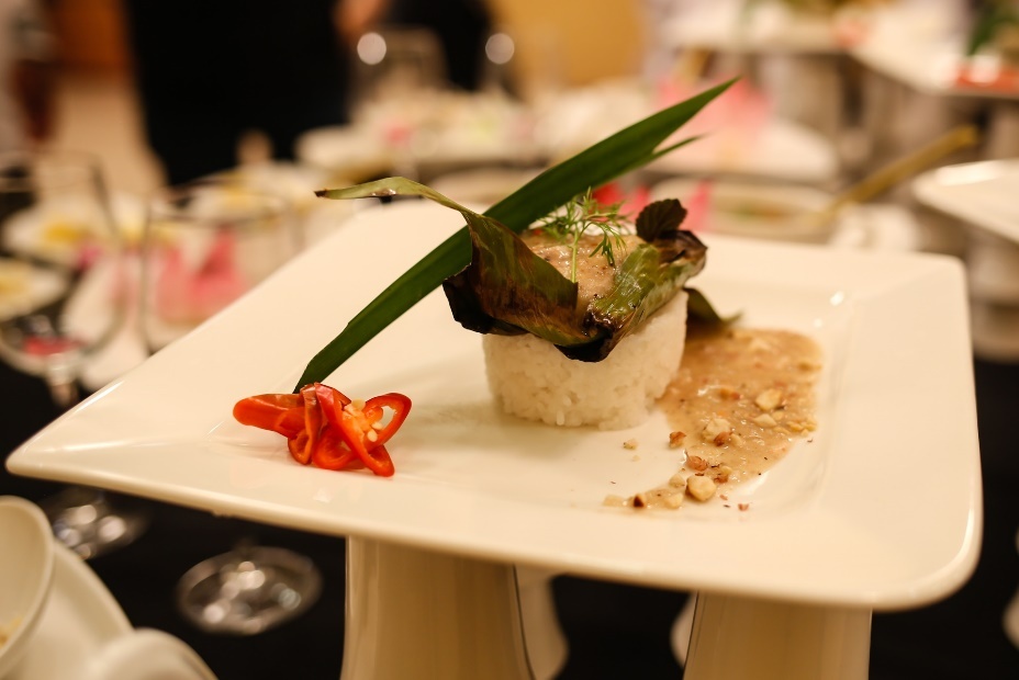 | Một món ăn gói tròn vị của 3 loại: thịt lươn, ếch, cá hồi mang cái tên rất thơ Đồng quê xứ Đoài của các đầu bếp Mercure Hanoi La Gare. Các nguyên liệu được chế biến cầu kỳ là lươn nướng riềng mẻ, ếch trộn hạt sen chiên, cá hồi kho kiểu truyền thống. |