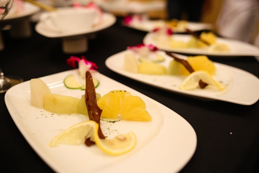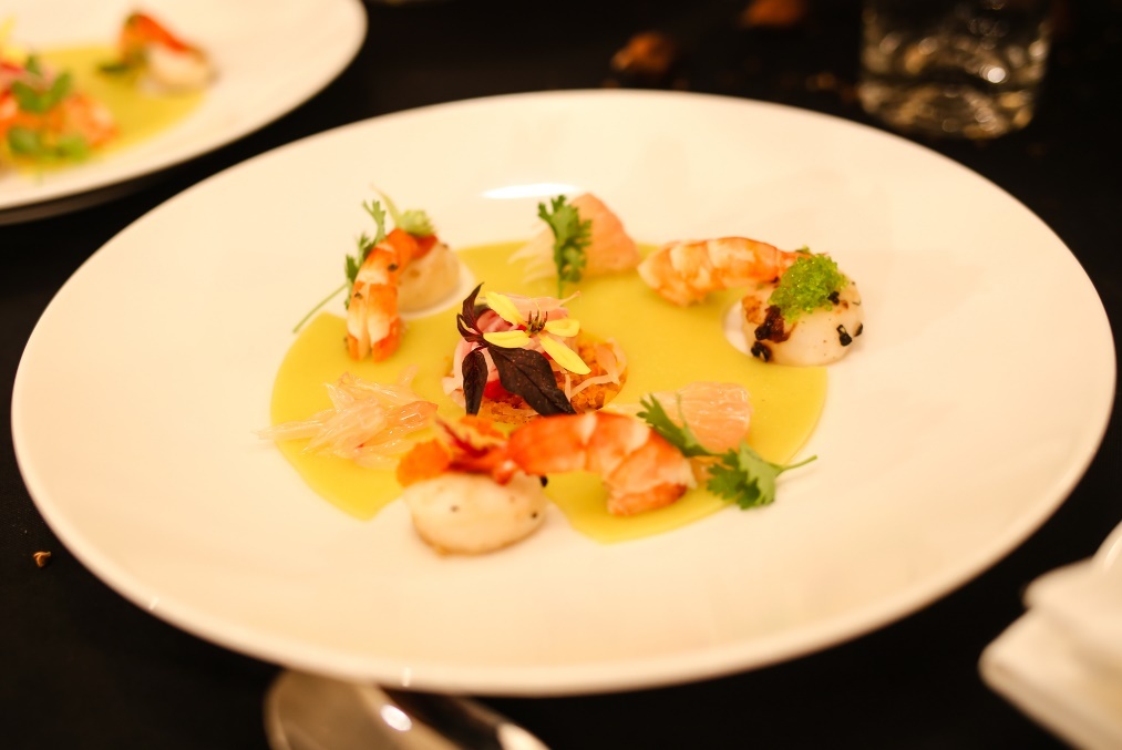 | Salad tôm hải sản và hoa quả nhiệt đới là biến tấu đầy ngẫu hứng từ các đầu bếp. Không chỉ đem đến vị thơm ngon, món ăn còn hấp dẫn nhờ cách bày biện đầy màu sắc. |