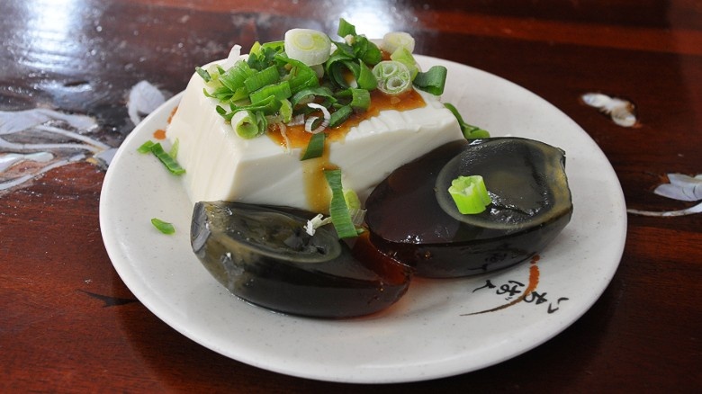 Đậu phụ trứng bắc thảo: Sự tương phản về màu sắc và mùi vị của hai nguyên liệu chính tạo ra nét độc đáo cho món ăn này và rất dễ gây nghiện. Đậu phụ và trứng vịt bắc thảo được cắt miếng, rưới thêm dầu mè, dấm, xì dầu, thêm hành tươi, thịt lợn xé sợi. |