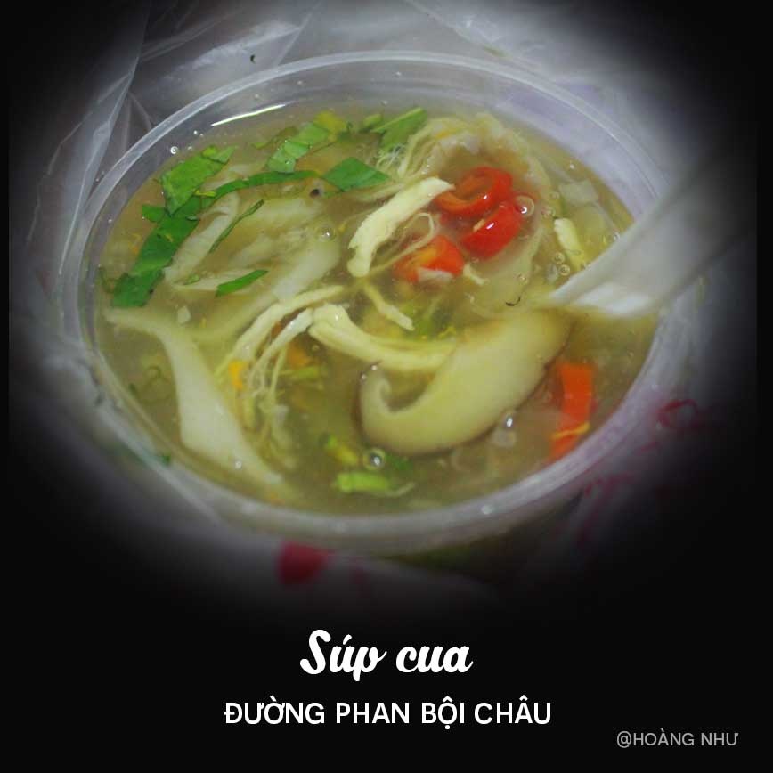 Chén súp cua trong, hơi quánh, nhân súp có thịt cua, trứng cút... Trong thời tiết se lạnh của Đà Lạt, ngồi bên nồi súp cua nghi ngút khói và thưởng thức chén súp thơm lừng này thì không còn gì bằng. |