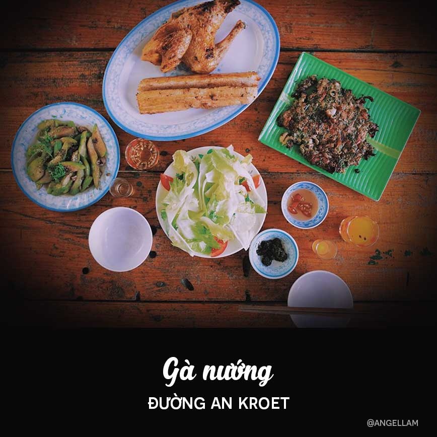 Gà nướng nhất định phải là loại gà ta, thịt chắc và dai. Da gà được nướng giòn rụm như chiên, ăn kèm với cơm lam dẻo rất thơm và ngậy. |