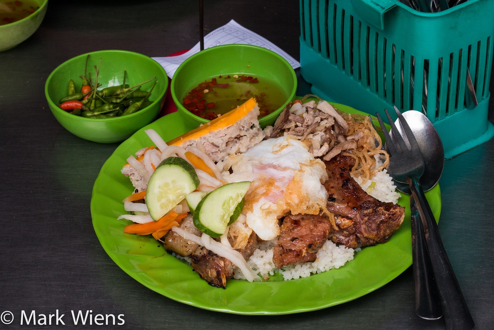 Cơm tấm sườn nướng: Bạn khó lòng có thể bước qua một quán cơm tấm mà không ghé vào, bởi mùi thơm quyến rũ của món ăn này. Một đĩa cơm tấm gồm sườn nướng, bì, chả, trứng ốp, dưa góp và rau thơm. |