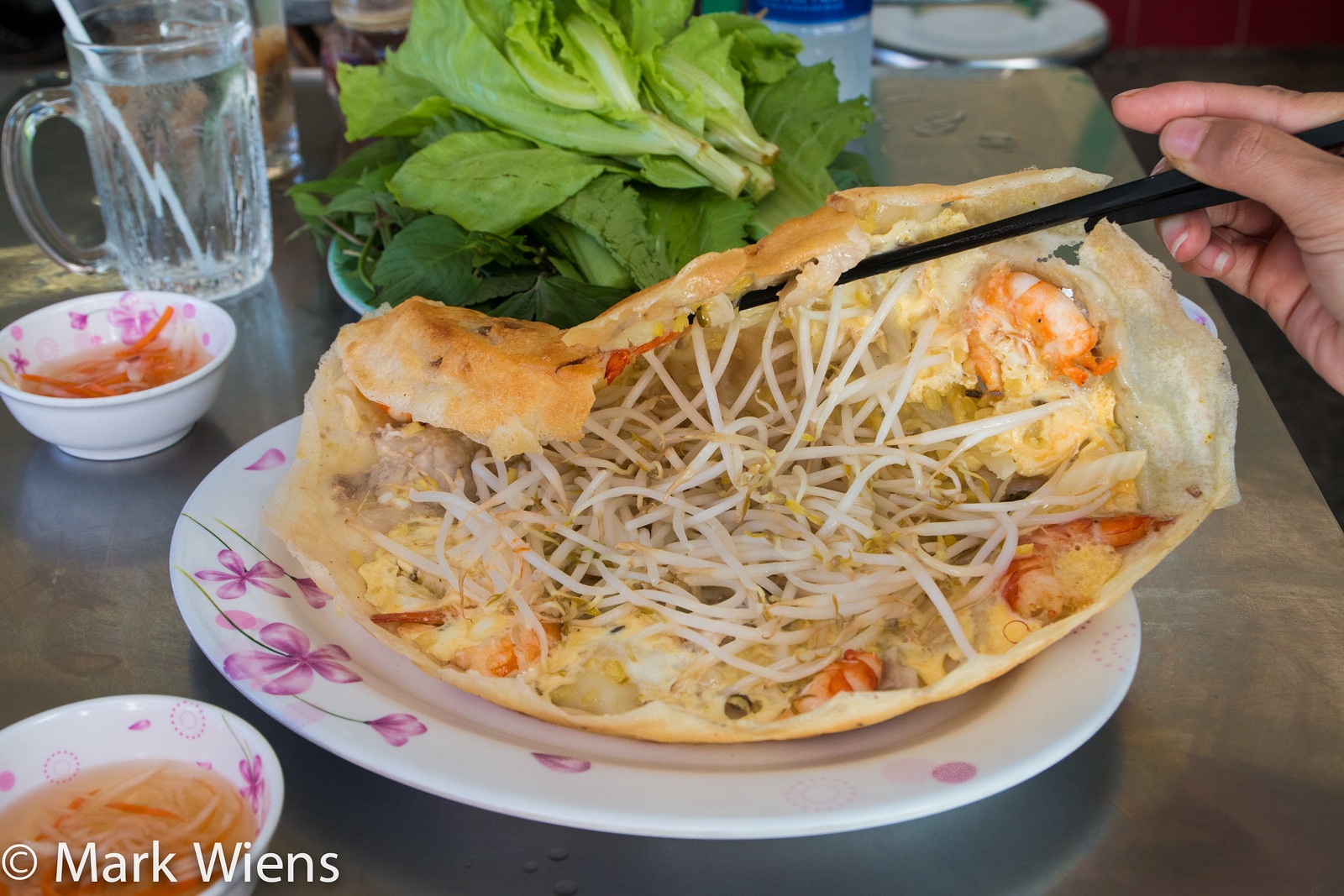 Bánh xèo: Bánh có lớp vỏ bột mỏng giòn tan và phần nhân tôm, thịt, giá đỗ. |