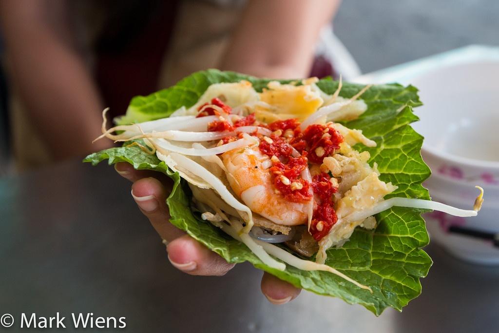 Hãy lấy một miếng bánh xèo, cho thêm rau thơm và chấm với nước mắm cay, bạn sẽ cảm nhận được hương vị tuyệt vời của món ăn này. |