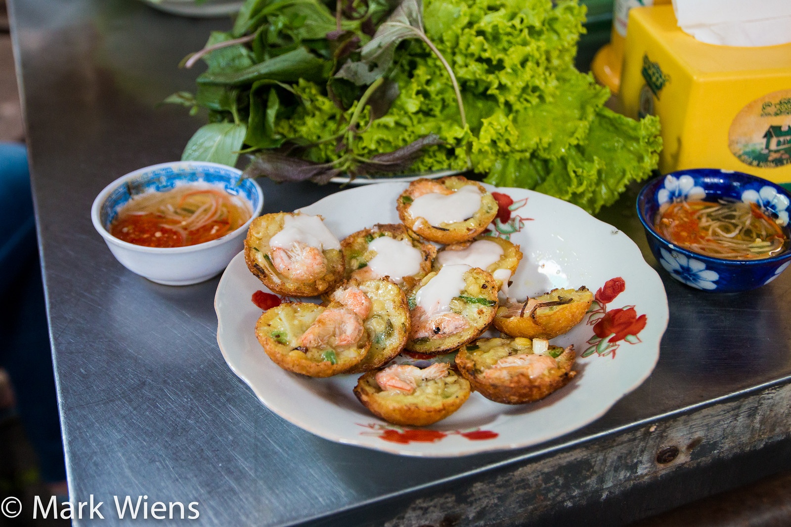 Bánh khọt: Bột bánh được làm từ gạo ngon trộn thêm một số nguyên liệu tùy từng hàng. Người bán rót bột vào chảo khuôn đặc biệt đã có sẵn mỡ nóng, sau đó cho thêm tôm tươi, chút hành và để tới khi bột chín vàng. Bánh khọt nhỏ, vừa miệng và được chấm với nước mắm ngọt, có rất nhiều ở chợ Bàn Cờ (quận 3). |