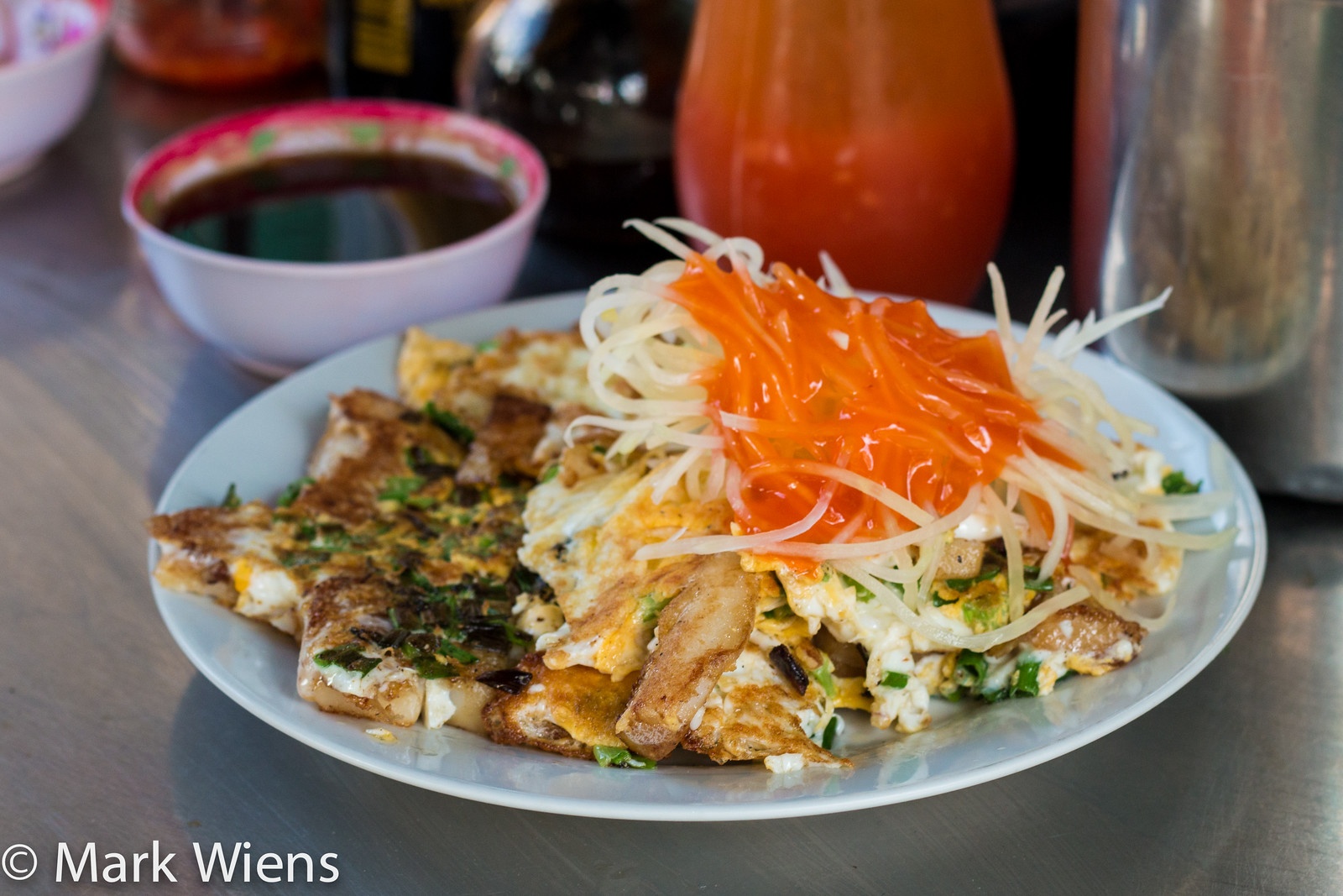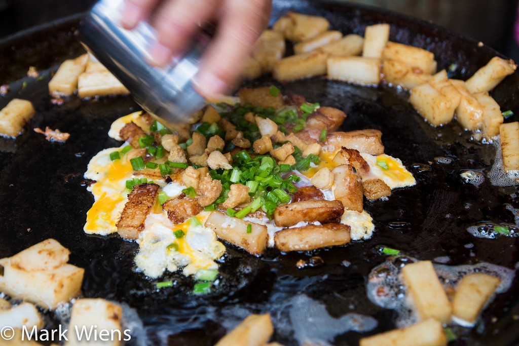 Người bán rán vàng một mặt, đập trứng gà lên, thêm ít hành lá và củ cải muối trước khi lật bánh. Bột chiên có mùi thơm hấp dẫn và vị ngậy béo. |