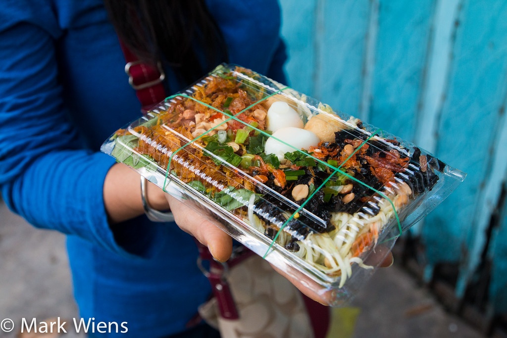 Bánh tráng trộn: Món ăn vặt này rất phổ biến, với nguyên liệu chủ yếu là bánh tráng cắt nhỏ, xoài xanh, thịt bò khô, trứng cút, rau thơm... |