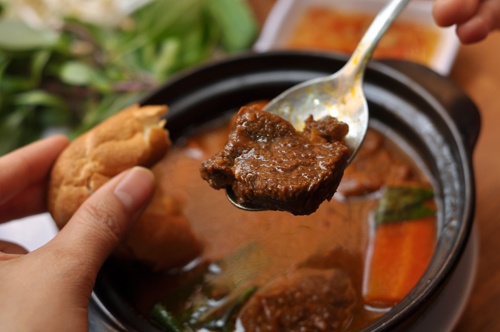 Bò kho là món ăn gốc Hoa và rất phổ biến ở TP HCM. Với thịt bò nạm có nạc xen lẫn mỡ được hầm mềm nhừ cùng hỗn hợp gia vị đậm đà, thơm nồng, thêm cà rốt khiến món dễ thưởng thức. Bò kho có thể ăn cùng hủ tiếu, cơm, bánh phở nhưng ngon nhất vẫn là bánh mì.