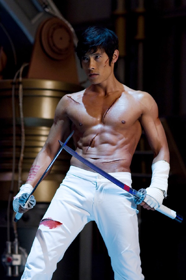 | Trong bộ phim Hollywood G.I. Joe: The Rise of Cobra (2009) với vai Storm Shadow, tài tử xứ Hàn Lee Byung Hun đã khiến khán giả thích thú khi để lộ vòng ngực săn chắc và cơ bụng 6 múi. |