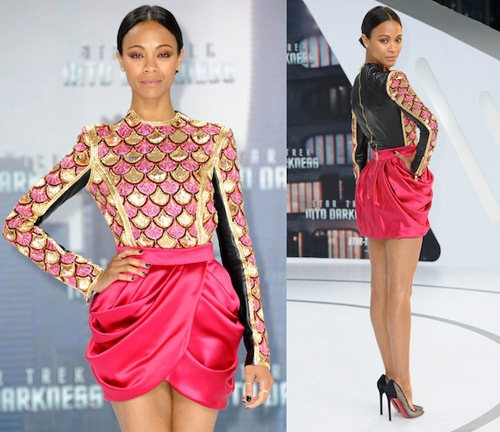 | Zoe Saldana thanh lịch với chiếc váy của Balmain. |