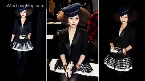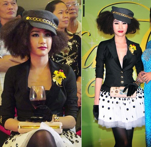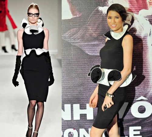 Trong buổi trình diễn của Louis Vuitton, Phạm Băng Băng diện toàn thiết kế mới của hãng với chân váy xòe chấm bi, vest đen, mũ và mái tóc xoăn tít độc đáo. “Học hỏi” ý tưởng từ người đẹp nước bạn, Ngân Khánh cũng xuất hiện với tạo hình "sao y bảng chính" tại lễ trao giải Mai Vàng 2012.