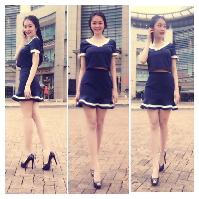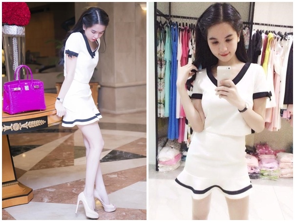 | Một trong những thiết kế mới được Ngọc Trinh yêu thích và trưng diện khi gặp gỡ bạn bè. Mẫu trang phục này là sản phẩm được cô bày bán trong cửa hàng của mình cùng thời điểm người đẹp diện khi xuống phố. Kiểu dáng thiết kế váy loe áo crop-top trẻ trung cũng là sản phẩm bán chạy trong thời gian qua. |