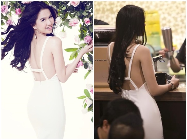 | Linh Chi đụng hàng đàn chị Ngọc Trinh khi mặc lại bộ đầm trắng khoe lưng gợi cảm. |